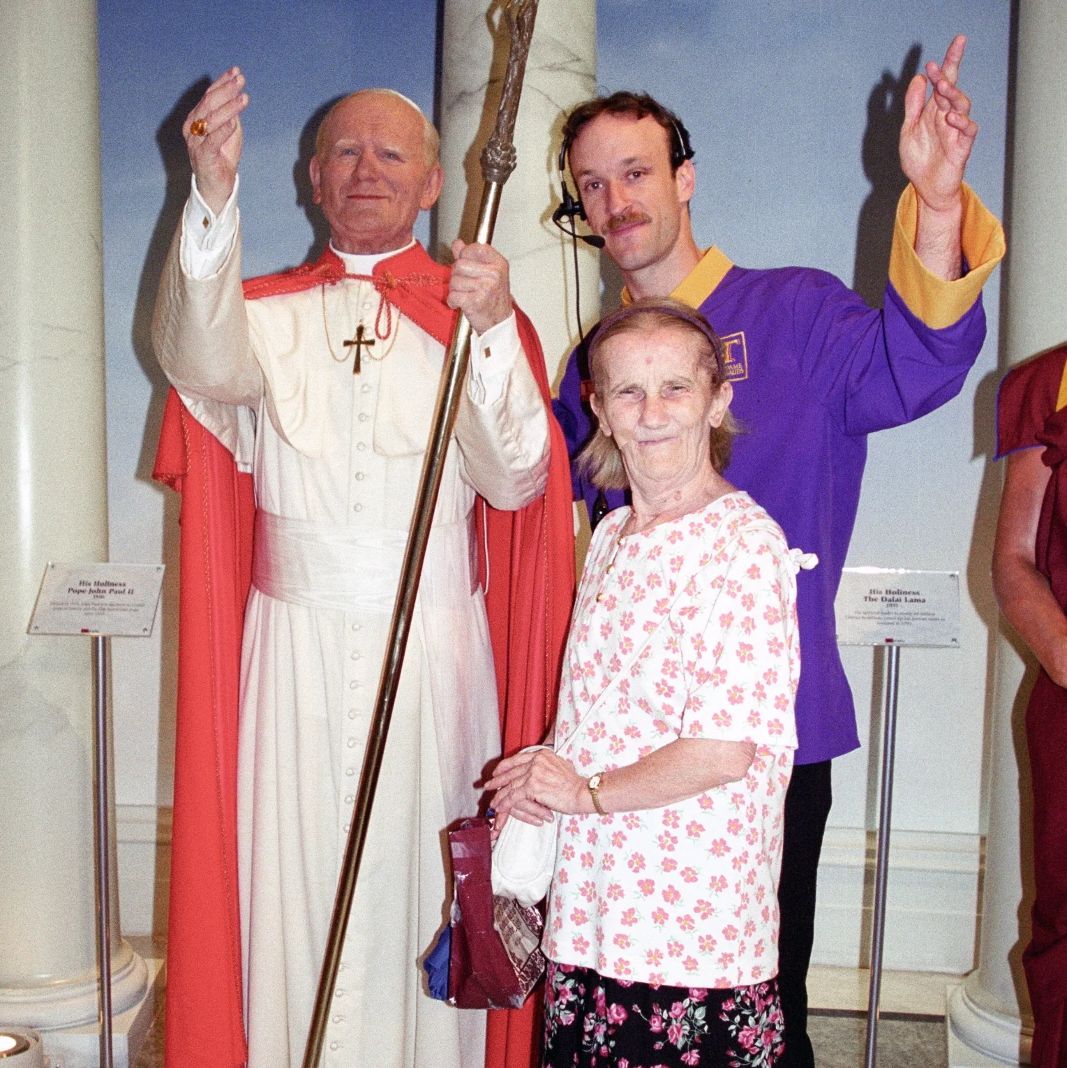 I wanted to place myself as working person inside this weird machinery and see how it affected my behavior. I began to more and more slip into character at work and often spent my shifts playing with guests and acting like a wax figure (which the hosts were often mistaken for) I snuck in Photographer Suzanne Wimmer to document my interactions with the guests and videographer Richard Sandler to shoot video and interview the public. Twenty Eight prints document the series, and the video Wax World gives a deeper look inside this world i inhabited.